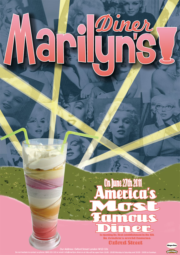 James Howard - Marilyn's Diner The theme for this assignment is the promotion a 1950’s style diner. The diner is to be based in the UK and will have a branch in each major city. For this assignment I hope to create a number of items such as; a logo, I will make this bright and colourful as it is one of the main assets, a menu which will feature the logo I also want to make sure that the items I put into it are similar to what was produced in the 1950’s, a flyer which will entice people into visiting the diner therefore it must be bright and must feature the logo and other necessary information, a business card which will have contact details and an address of the diner, a compliments slip which will be given with the bill to thank customers for visiting the diner and finally a t-shirt as a promotional item. The t-shirt will have either the logo or typography.