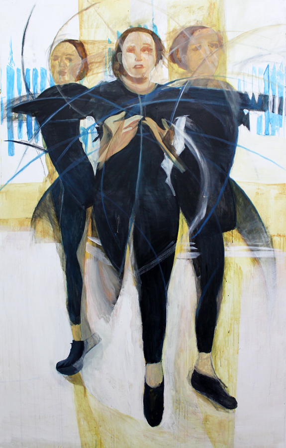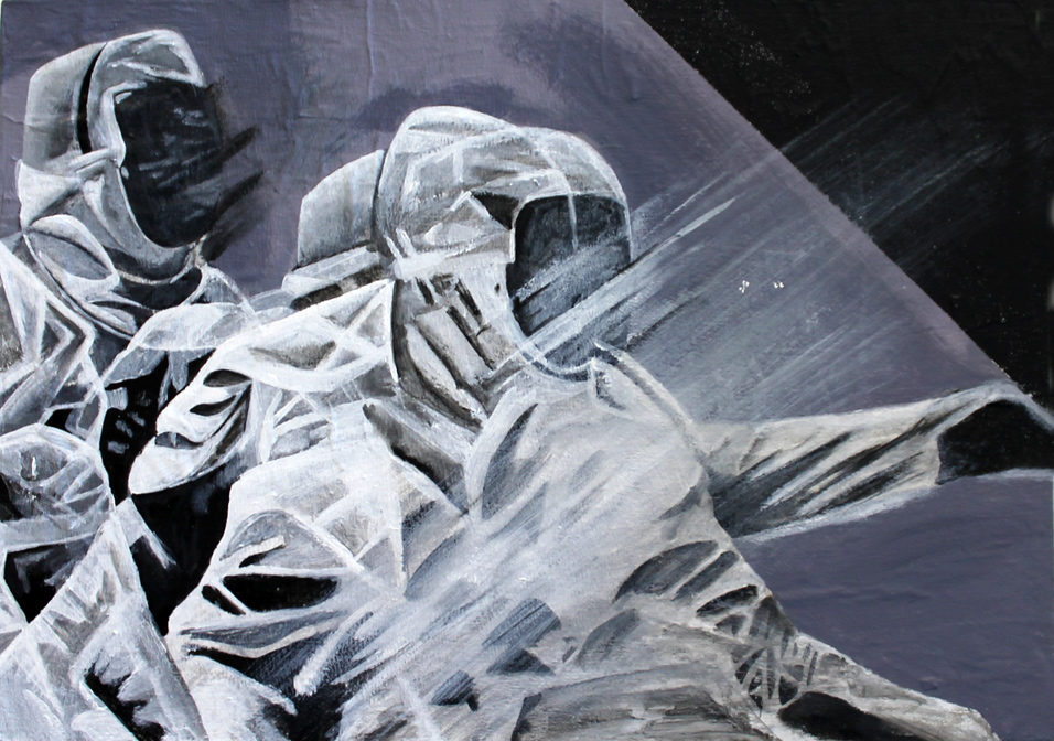 Michael Helsby - Movement For my final major project, I have decided to base my work around the theme of movement. In London I was drawn to a piece of work by Dorothea Tanning 'à mi-voix' which translates as 'a whisper' which appears to depict movement. I really liked the style and technique in the painting. I was also really impressed by the talent and skill that was painted directly on the walls around the East End of London, during an 'alternative' walking tour lead by Keir, a street artist himself. My tutor has advised that I look at the work of Li Hill, a street artist that uses a painting technique where he builds up layers of transparent colour and tone to capture a sense of movement. I am going to look at the series of work he has done based on fencing. I am planning to do a pastiche of a section of one of Li Hill's pieces so I can get to grips with the subtle painting process. Capturing the lines and layers to get a sense of movement. I plan to approach my paintings the same way he does, using images of football or dance instead of fencing. I plan to work large scale on my main piece so it's similar to how Li Hill works but on a board instead of building. In my painting I will be using watered down, transparent layers of paint, so it's not opaque to build up the sections of the image, adding layers of paint to get the sense of movement. To get the images to paint from I need to get photographs of someone in the process of moving. I will take these images and process them using Photoshop to layer all the images so I have good source material to work from. When I paint the image, I will paint the first image on and the paint other that image with the other images and layer them up but so I don't lose the original image I'll use watered down paints so I still have the image in the background.