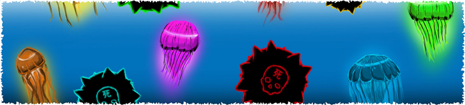 Joni Ashton - Jellyfish When this project started out, I intended on creating a mobile app capable of choosing a song at random and generating a level procedurally based off the fluctuations and variables in the song. I wanted this game to be a simple idea, with a simple design and a neon theme and colour scheme. There wasn’t much story included in the game but the main character was Jellyfish named Mas, whose quest was to return to his family. The idea behind the game was for the user to move the character with their finger around the mines, these mines would destroy the user and fail the mission if made contact with. The starting point for my research was different existing games, art styles and media. I looked at other song based a rhythm based games such as Rayman Legends, Crypt of the Necrodancer and AudioSurf. My Target audience was literally anyone who liked music and owned a mobile phone, the art style was simple and colourful and the gameplay was easy to comprehend, meaning it was open to anyone who wanted to play. The art movement that influenced me the most was neon, so many light stream art pieces look so good and effective against dark or contrasting backgrounds so I took a lot of inspiration from art pieces I could find in this style and media that used this style, when thinking about how well colour can be shown, the light flares of neon are some of the most effective and eye catching, this is why I used them.