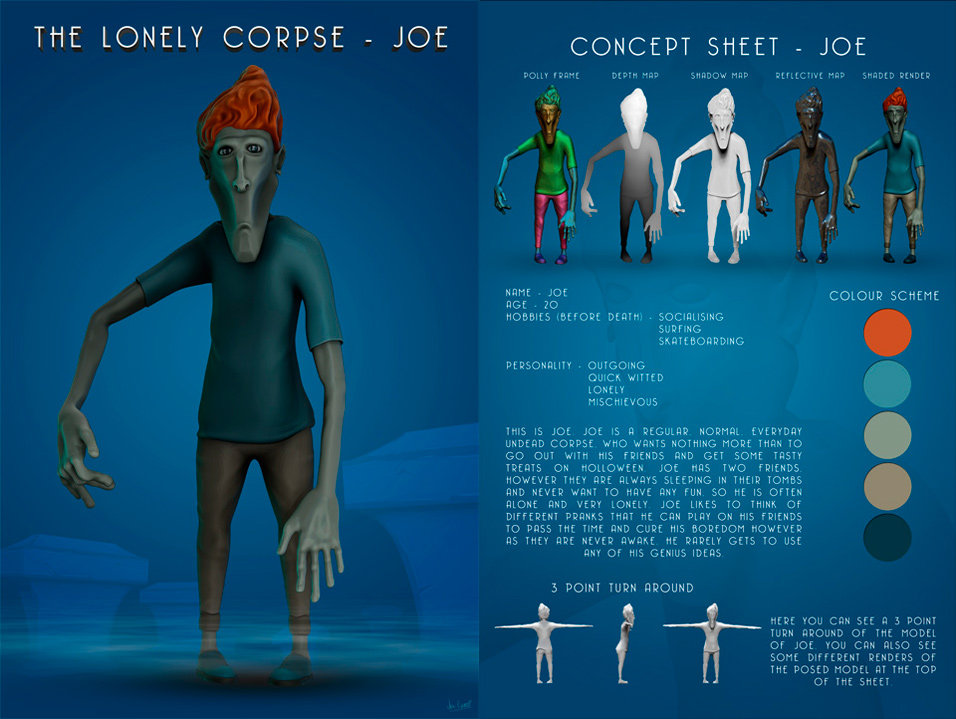 Jack Everett - The Lonely Corpse My game is called The Lonely Corpse. I came up with this idea while brain storming my two starting points which were ASSEMBLE and TRAPPED. The game is about a character called Joe who is trapped in a grave yard and has wants to escape on Halloween because he is lonely on his own in the graveyard and Halloween is the only night where he will be able to get out without anyone noticing him. To do this you must raise some more undead from their graves to help you escape. I think that this is a very unique concept as I have never seen anything like this in games or any other media. I wanted to keep the concept of the game quite fun and playful and I think that I achieved this goal when creating the game concept.