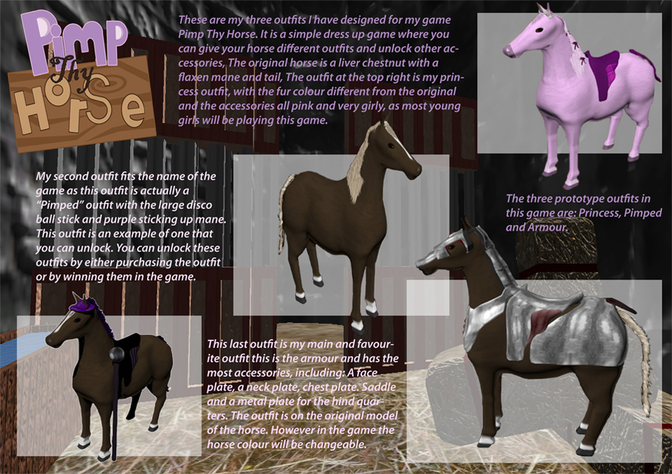 horse, only small but big enough for one horse to live, I created a stabled area, hay bales and even a running water trough to make the game look more realistic. At this point I started thinking about what I could of done with my game if I had more time, I decided that if I had more time I would of wanted to make it into a looking after the horse game where you would have to groom it and feed it and maybe even ride and name the horse! I then started experimenting with making my horse move I tried a few websites to help rig my horse to move, sadly these websites didn’t have anything on making my horse walk! So I had to do it all manually. I used 3DS Max and gave it a CAT skeleton that I put inside the horse and move bit by it in the running sequence of a horse and recorded the movement! This took more than a few attempts, finally I was able to get my horse running. But still has a few problems, however with the little time I had left I couldn’t carry on with making my horse move. When I went back to my 3D horse I was then at the point to start texturing it, I textured the horse at first a grey (White) as my pony from home (Pepsi) is also white. But I decide to change the colour from a grey to a liver chestnut with a flaxen mane and tail (brown with beige mane and tail) this is the colour of another one of my horses (Oreo) so the colour/ texture for my 3D horse wasn’t hard to find, Once Textured with a mane and tail I was then able to move onto the actual outfits for my horse. I created the armour for my horse first I did this by selecting polygons and cloning them to element I was then able to shape and alter the polygons without touching the horse, I created: A face plate, neck plate, chest plate, armoured saddle, and a plate for the hind quarters (The rear end) I then textured them a silver and maroon colour making the horse look as if it was royal and ready for battle, I also gave the armour a small shine to make it look metal. Next a made the pimped outfit this outfit was rather difficult to make as the hat caused many a problems however with lots of messing with polys I finally managed to come out with a decent looking hat, at this point my time was running really low so I decided that I would only be able to do tasters of the pimped and princess outfits, I changed the texture of the pimped saddle to purple stripes and black, I also gave the horse a ‘pimp stick’ to make it look cooler I even changed the colour and style of the hair the colour was changed to purple and the style was changed to a Mohawk. I went onto make the taster outfits for the princess horse. I created a tiara, and a pink saddle for this horse I also made some nice pink bows the I placed on the tail and down through the mane I even changed the mane/tail colour to a Pink, furthermore I even changed the body colour of this horse to a baby pink, this makes the horse a little different to the others. Finally I had finished my models and environments, overall I was very pleased with my outcome of 3D Models however there would be a lot I would change, I would have changed the aim of the game to a taking care of the horse game, and also would have liked to spend more time on defining my horse in ZBrush to come out with a nice smoothed looking horse.