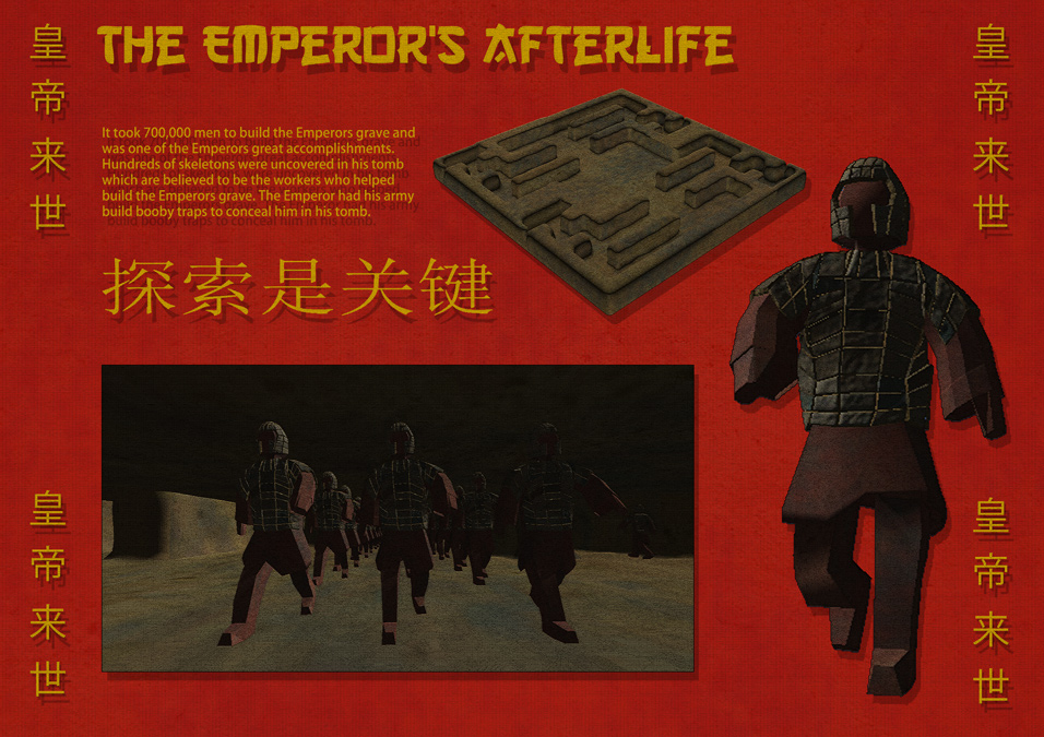 Joe Walker - The Emperor’s Afterlife At the start of my project, I set out to create some very detailed models and import them into a unity environment. The concept I chose was the terracotta army and I based my idea historically on the Chinese terracotta army. I wanted to make my environment and models look as realistic as possible. In this project I will set out to achieve making a character animate in a unique environment in which the player is able to explore. The concept of my game will be about protecting the emperor from his afterlife as I have researched. The narrative side of it will be who has power over the army, you or the emperor? I will create a range of assets in 3ds max to place in the environment and model some armoury to be fitted onto the character. This character will be seen in 3rd person view to give the user an opportunity to look at the armour and detail on the character model. I will base my research on the terracotta army which was made of pottery whilst focussing on the concept of stone. In this project I will be mainly focussing on the 3D model skill side to create a range of detailed and unique models in an environment. Throughout the project I may change my ideas and gather more influences and explain why I have changed my previous ideas. Overall in this project I feel that I have completed the targets I set out to achieve, with this being the models that I created and an environment that a player is able to walk around. I did say that I would focus on created |
