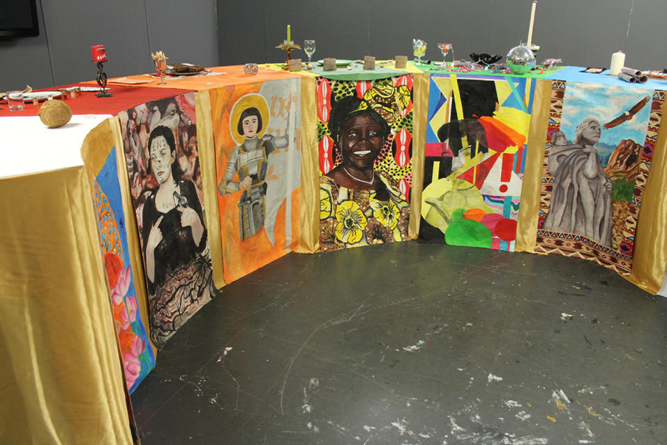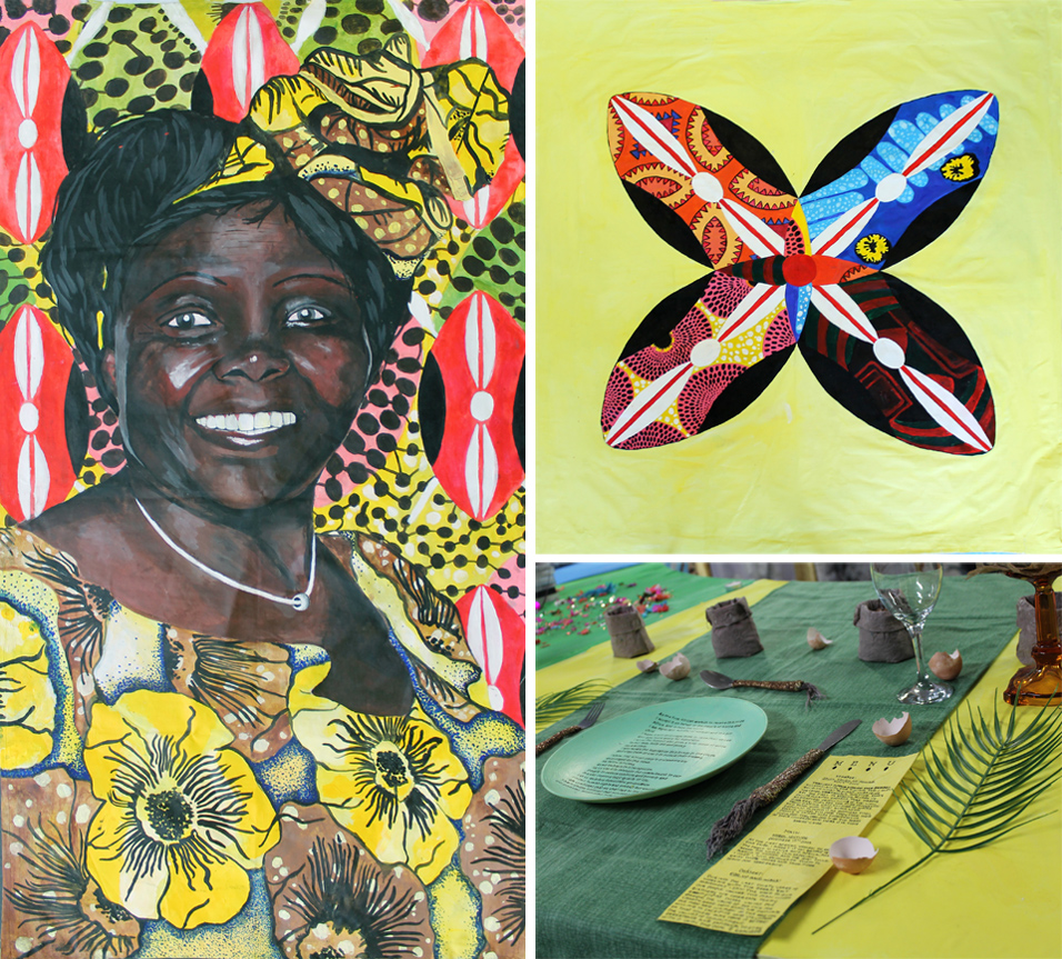 Emily Spencer - Inspiring Women In History For this project I made my own version and response to Judy Chicago's dinner table, following the theme of powerful women. My idea of a powerful women is someone who had achieved something great whether that be by standing up for what they believe in, excelling in their career or someone who had gone against all olds to achieve something. I represented my theme by showing my women (Wangari Maathai) in a positive light as well as having links to her achievements throughout my work. I made 2 panel pieces and designed a table top in response to the theme and concept. My first panel includes a portrait of Wangari Maathai, she is placed in the middle and takes up most of the panel as she is the main point and I wanted people to notice her first. The first panel also includes traditional Kenyan patterns and flag. For the second panel I took 4 key achievements from her life and represented them in 4 shaped abstract patterns. I think the audience will understand parts of my work which is what I wanted as I hope people will be intrigued by Maathai and go and looked into the work she's done. For my first panel I looked at 2 different artists. To begin I only looked at black artist which empowered other women of colour through their work. I did this because I wanted to link with the theme of powerful women as well as the fact Maathai was a proud African woman. The first artist I chose was Amy Sherald, who focuses on portraits. I liked her style of painting which is why I used it for the inspiration for my portrait of Maathai. I tried to recreate the simple tones and the smoothness of Amy Sherald work within mine. |