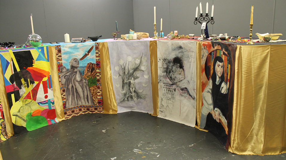 stomach, drinking her blood and there is even an account of a man who attempted to shoot her with the loaded gun provided which was part of the piece. These things are referenced through the imagery on the main panels, the loaded gun appears in her portrait, as well as the thorns over her stomach area. I also made a reference to her Balkan war piece, in which the thousands bloody cow bones she attempted to wash is the background of the portrait, this was to also represent how she does NOT hold back from symbolising unpleasant subjects. I feel like my project was very successful, and I managed to complete my panels in a safe amount of time and to a standard I believe was acceptable. At first I was careful to paint the portrait in washes to make sure the paint did not crack or damage when the fabric is being manoeuvred, but I then discovered that the fabric was not as weak as I thought and used more paint to my liking. This made my piece stand out and look much bolder, which was important for the subject matter itself. I painted these objects from observation to achieve as much likeness as possible, and I feel like I have successfully implemented this. I feel that research has been sufficient, although sometimes I wish I could show my flow of development in a smoother fashion, rather than being unclear about some ideas in the stages of generating ideas and refinement of my pieces. |