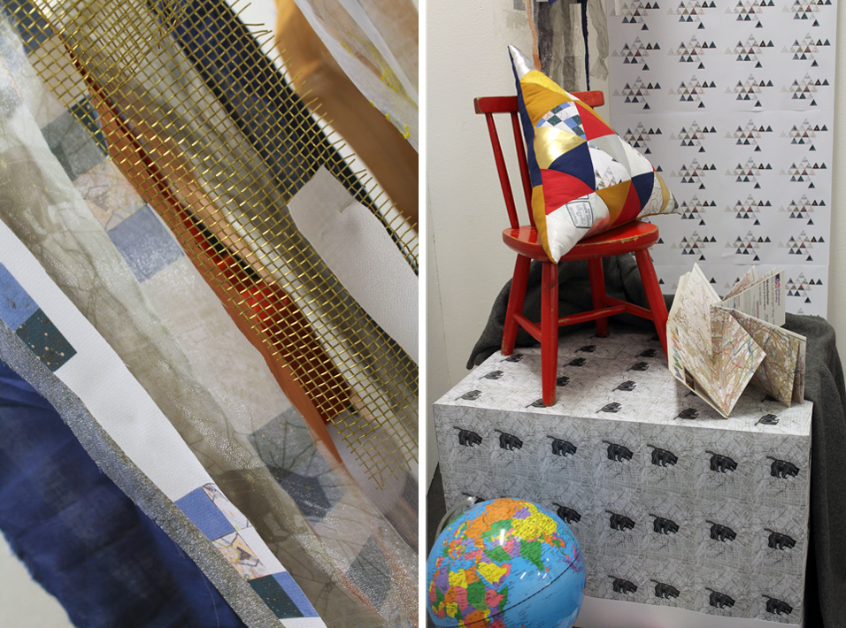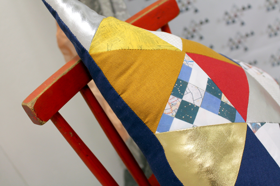 Interior can mean anything from a neat little rug in the corner of a room to a chandelier made from anything you can think of. Working the concept of interior design into my work wasn’t difficult at all, I knew the basics of what I wanted to make and started from there. I ended up making a triangular cushion that features a patchwork triangular design and another patched up design |