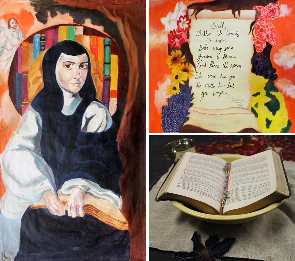I interpreted Sor Juana's love for writing and speaking her mind not matter how, I should this by referencing a quote from a poem she wrote to the church. I was also influenced by religious art work and it shows within my main piece, and reference piece, because of the halo that is around her head, paintings of saints normally have a halo surrounding there to represent their faith and I wanted to interoperate that with a twist by turning it into a book case and globe. I did stick to my schedule for my first one and it was successful but for my second piece I did stick to the schedule but I wished I had more time to define and work into the flowers because they don't look as defined as I was hoping to do, I did my table on time within the time schedule and I came out very successful and they all worked together very well. And I made sure to improve areas and take not of the things people suggested to change. |