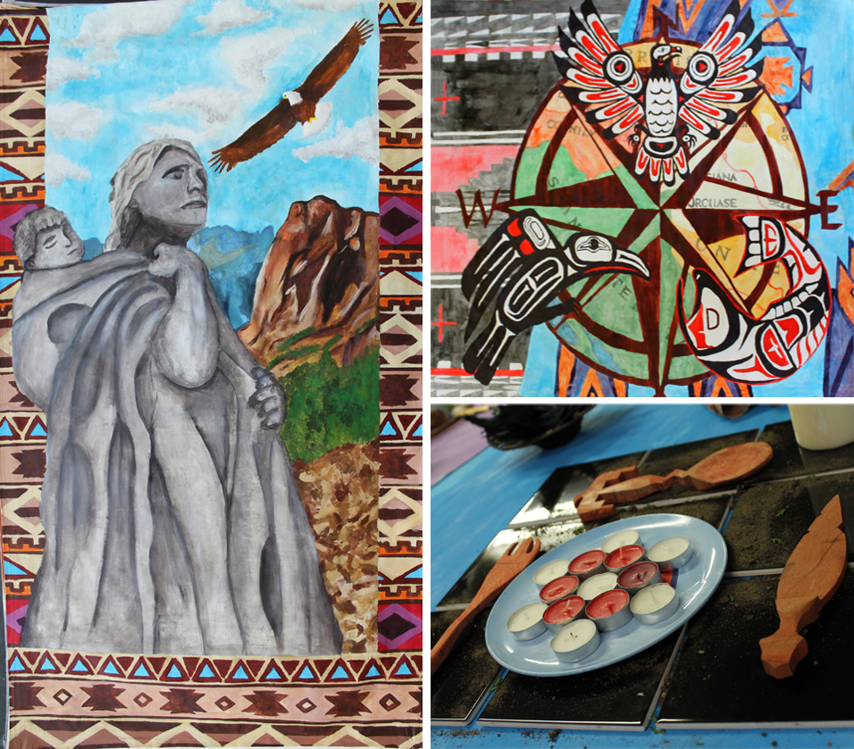 Millicent Patten - Inspiring Women In History I have created a table setting for a Native American woman called Sacagawea. I used Native American patterns and symbols to show the tribes that she was from. I painted scenery from the place she lived and from a time period that isn't too different from hers. I used colours that are symbolic of her tribes like turquoise, blues, red, greens and different washes of black. I painted animals that are scarred to Native Americans like a salmon, crow and bald eagle. These animals represent the traits that Sacagawea had like courage and loyalty. They also represent the tribes that she was a part of. I used a compass, maps and water to represent my theme which is Sacagawea's journey. Furthermore, I used black tiles with soil on top of them as a placemat to show how America went from a lush, green forests and plenty of animals to a country that is very man-made. I was influenced by Native American culture and by empowering women. I was also influenced by artists Judy Chicago and her piece titled 'The dinner party', I was also influenced by artists Elizabeth Shippen Green and by artist Helen Hardin. Helen Harding has a bigger influence as she is a Native American artist and her style of painting is the best way for me to show Sacagawea's life. The way she creates animals is what I did for the big piece with the eagle, fish and crow. It is simplistic but effective. Elizabeth Shippen Green's use of colours and style of painting influenced the portrait that I created of Sacagawea. |