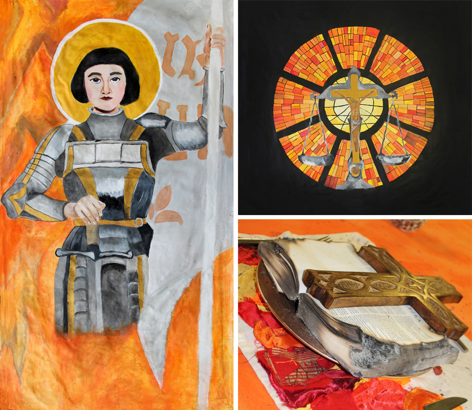Nikita Stamp - Inspiring Women In History The theme behind my piece was that religion is equal to justice. I represented that by including the scales of justice and the cross with Jesus on it. I also showed Joan of Arc surrounded by fire to represent what killed her. Also, with the stained glass window I wanted to show the glass from a church with the orange and yellow windows to again show the fire. I believe my audience will understand my work and what meaning I am getting across. I made sure to make the background of my stained glass piece is pitch black so that the orange and yellow stand out and be eye catching and make it look like the orange and yellow is trapping the scales and Jesus. I think that the audience will like how the colours complement the overall picture and don't drown anything out. My influences were powerful women who physically made a stand and made sure their voice was heard, and I think that Joan of Arc was one of those people women. I was also influenced how religion is the one factor that can start wars and how it doesn't matter who you are but if you disobey a book you can be punished by death. |